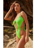 Maiô de tecido poliamida, com recortes que valorizam as curvas e laços para amarrações no busto, costas e cintura, podendo ser amarrado do jeito que preferir. Possui ponteiras nos laços do busto e pingente da marca em banho de ouro.